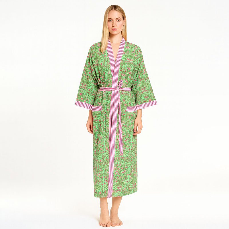 Embrace elegance and comfort with our Floral & Stripe Kimono Robe. Featuring a delicate hand-block printed floral pattern in shades of pink and green, set against a soothing green background, this robe is designed to add a fresh touch to your loungewear collection. The bold pink and white striped detailing along the edges and tie belt brings a modern contrast, making it perfect for lounging at home or enjoying a leisurely morning.